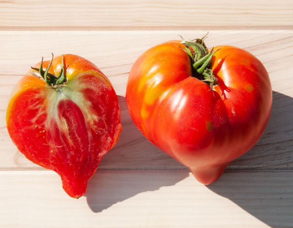 La tomate Téton de Vénus est une variété originale en forme de cœur avec une petite pointe caractéristique. Sa chair est fine, douce et contient très peu de graines, un délice à couper en tranches fines.