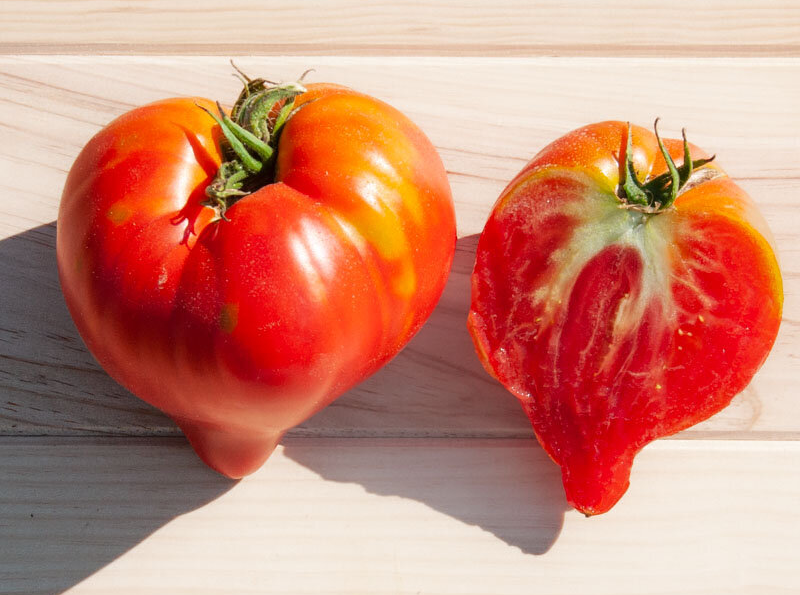 La tomate Téton de Vénus se reconnaît immédiatement à sa forme de cœur se terminant par une petite pointe. C’est une variété ancienne très charnue, contenant très peu de jus et de graines. Sa chair ferme et douce est particulièrement appréciée pour la confection de sauces épaisses ou de conserves, mais elle est tout aussi excellente crue. Nos plants de tomate téton de Vénus bio sont cultivés sur la ferme.
