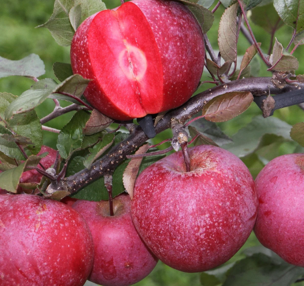 Le pommier Raisin Rouge produit de petites pommes d’un rouge intense, à la chair parfois veinée de rose. Son goût est sucré et original, avec des notes rappelant les fruits rouges. Cet arbre donne beaucoup de charme au jardin au moment de la récolte.